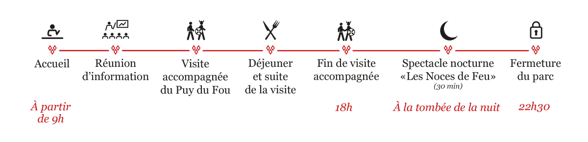 Cet Eductour sera rythmé par des moments qui vous permettront d'en apprendre davantage sur l'univers Puy du Fou. Vous profiterez d'un accueil personnalisé, d'une visite guidée à travers le parc, de découvertes captivantes des spectacles, d'un déjeuner chaleureux et d'échanges enrichissants avec nos équipes. Chaque moment a été imaginé pour rendre votre expérience à la fois instructive et inspirante.